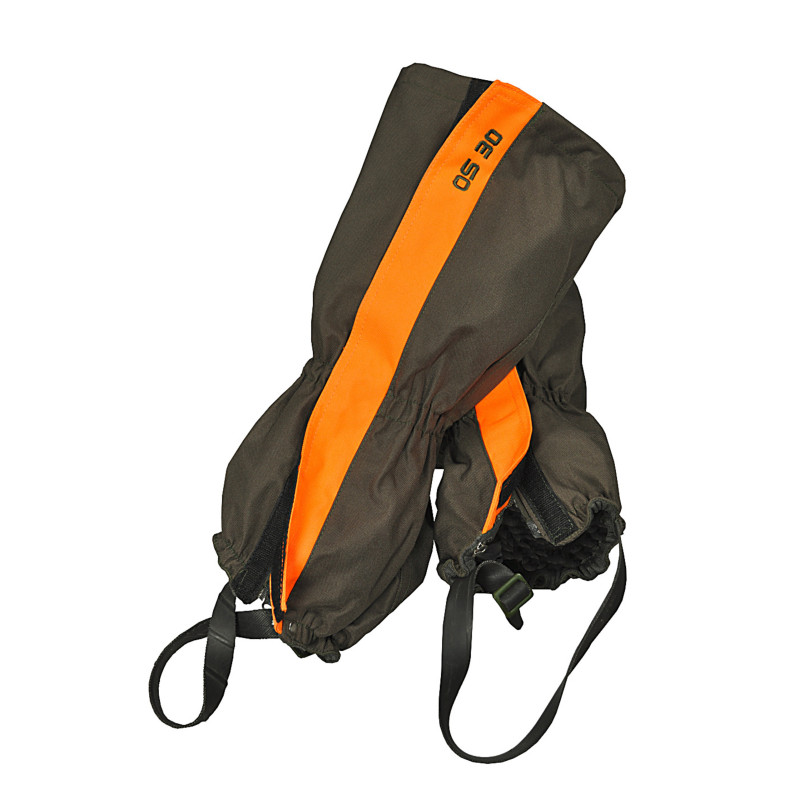 Extrémne pevné gamaše odolné voči tŕňom s oranžovými pásmi. 100 % polyester.
